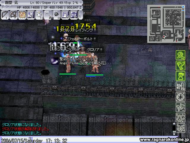 今日6時にバイトに備え1h寝るかなぁっと思い目覚ましセットして寝ました、 7時頃に目覚ましが鳴った記憶はあります、そしてそれを無視したことも(;ノД`) そして気がつくと11時半・・・ ・・・(゚Д゚;) Gv出損なったぁぁぁぁぁぁぁぁぁぁぁ(゚Д゚;)!!! ここのところバイト連続だったから起きれなかったんですよ(;´Д`)(言い訳 本当にごめんなさい(;ノД`) とりあえず一昨日に監獄に行きました、 PT編成クリエ、スナ、踊、プリの4人PT 前衛がいないから厳しいかなっと思ったのですがクリエ様のオーラホムがひらひら避けていい感じでした(・ω・) 昨日はODにトライ、ホムのFleeが若干足りてないからきついかなぁとおもいましたが中々いい感じに避けてくれました(´ω・) すでにMHPが4kいってるのでなかなか沈みませんヽ(゚∀゚)ノ バニルのFleeがいくつまでいくのかがちょいと気になりますね。 後なぜだか戦闘前はMAtkが230なのに戦闘開始するとMatkが280に(゚Д゚;) LvUP時にStrが20ほどUPして狩終わると元に戻るのも謎です(´ω・) 知ってる人がいたら情報にょろです~m(_ _)m PR